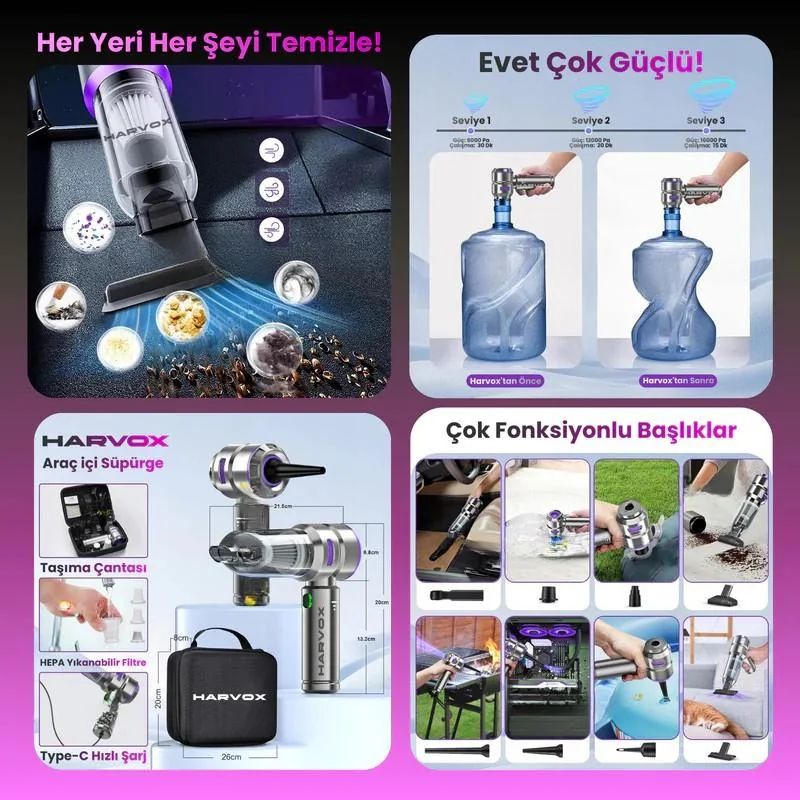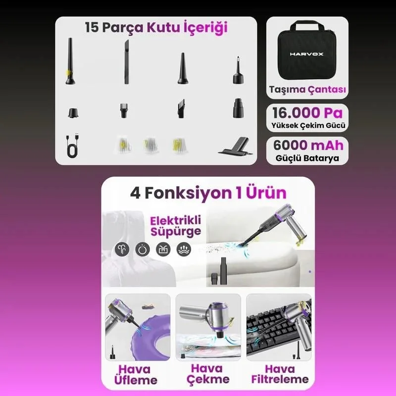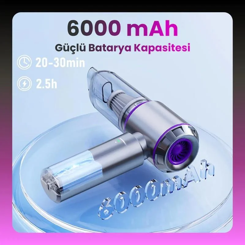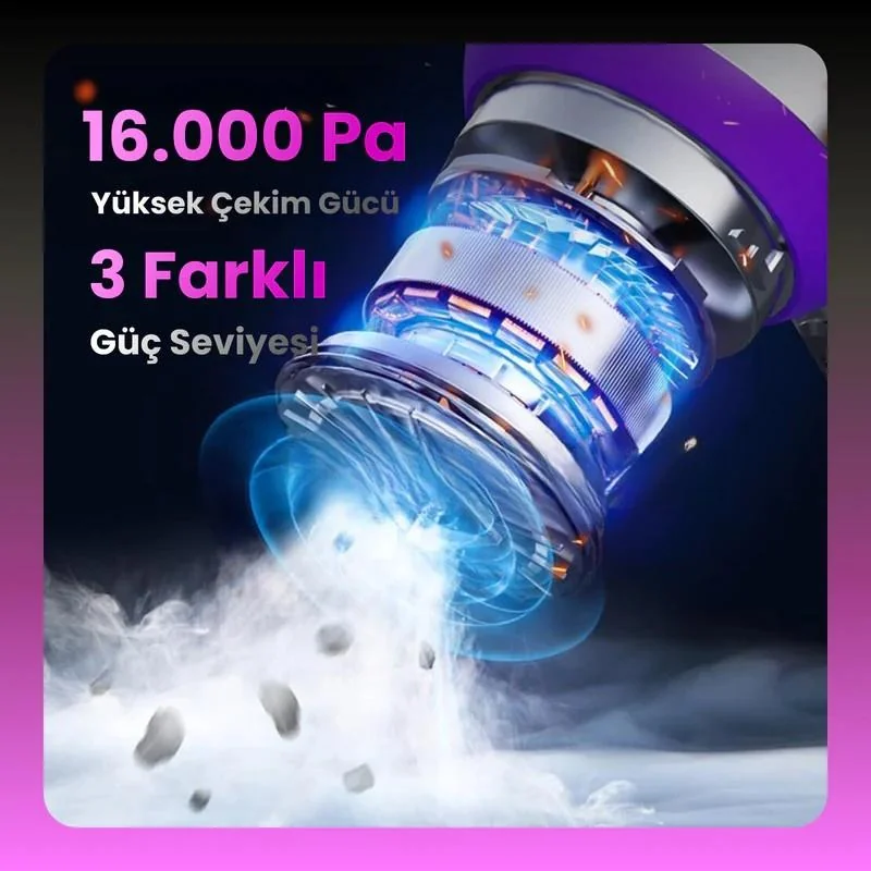 🔹 16.000 Pa Etkili Emiş Gücü 🔹 6.000 mAh Dayanıklı Batarya – Kesintisiz Kullanım 🔹 3 Aşamalı Güç Ayarı