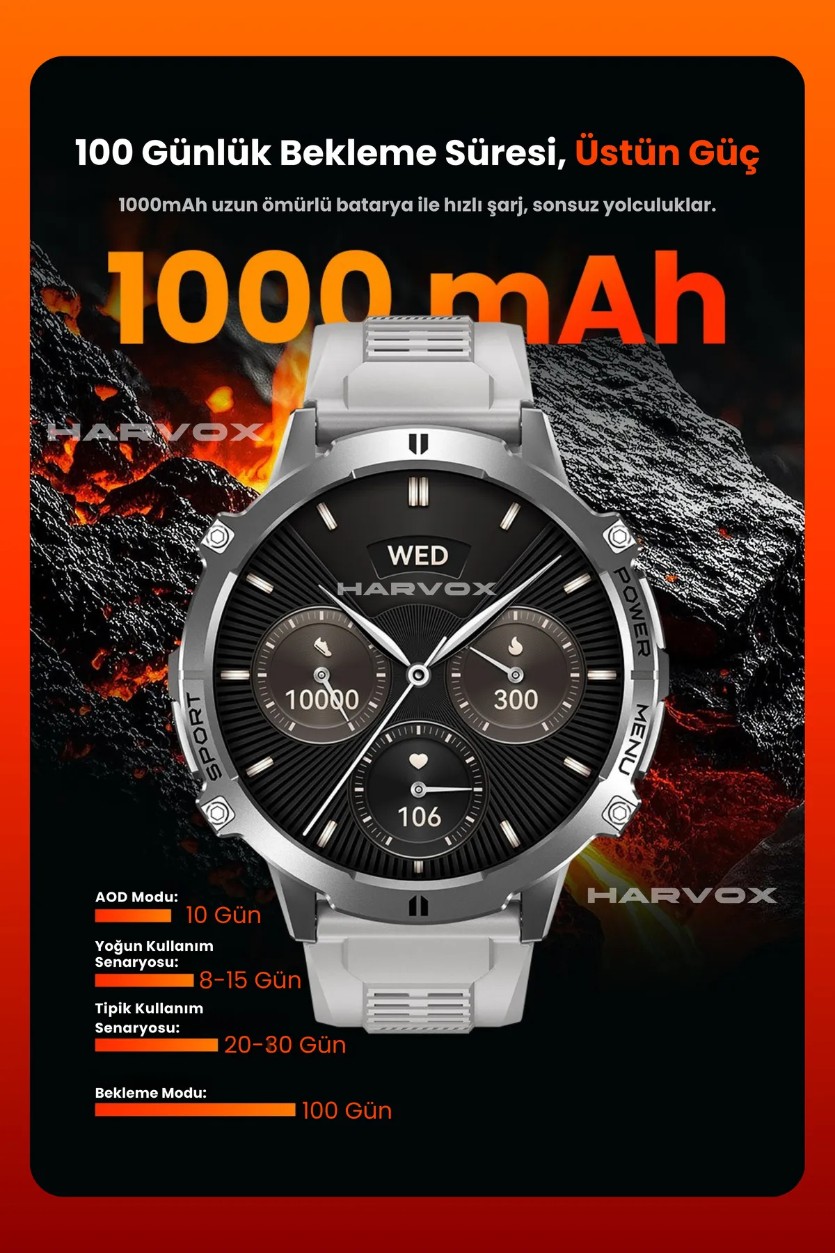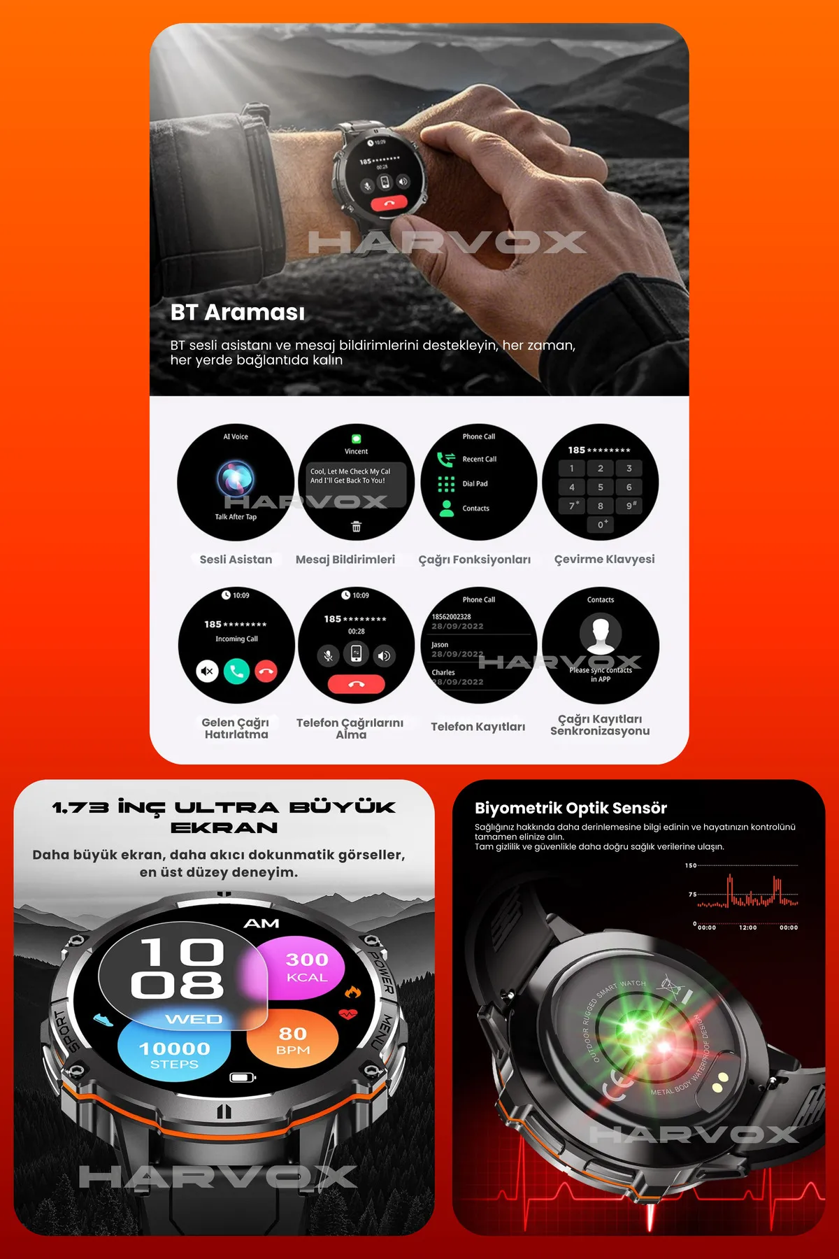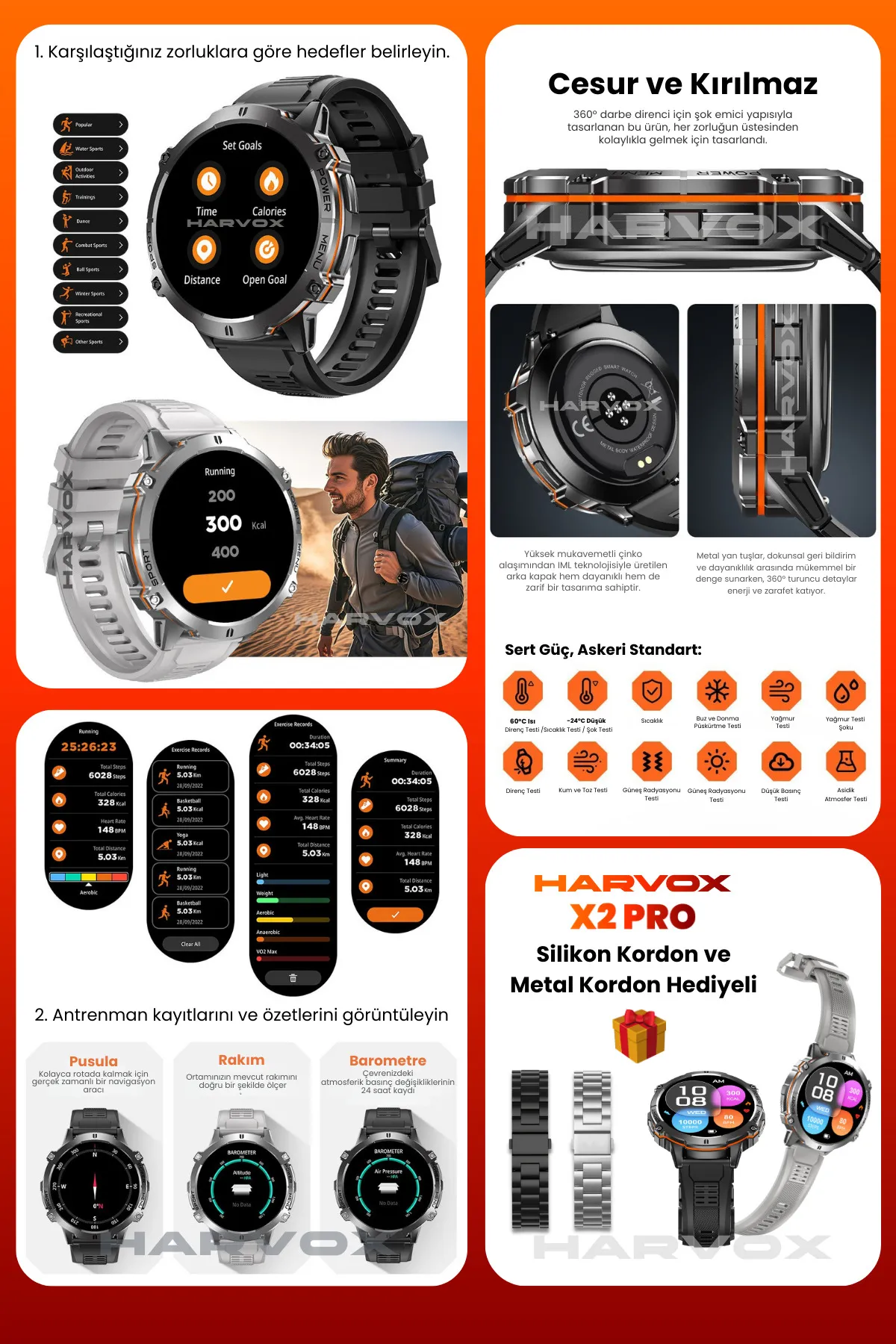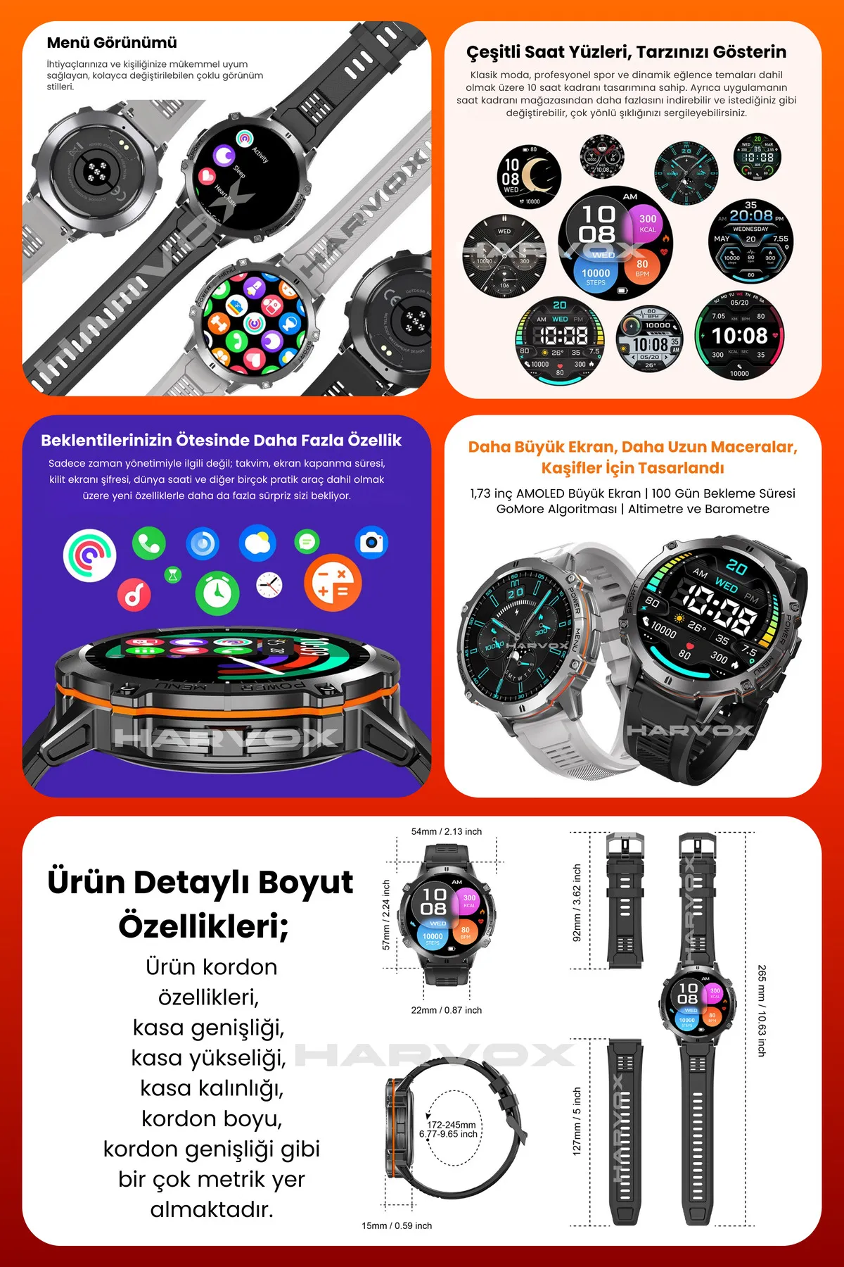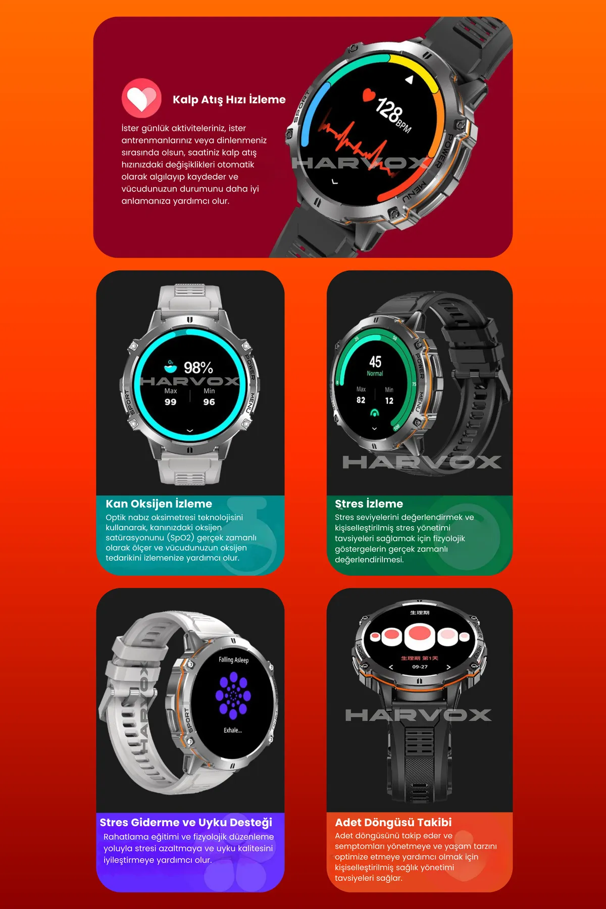 Harvox X2 Pro; 1,72” AMOLED tam dokunmatik ekranı, 100 güne varan pil ömrü ve gelişmiş sağlık takibi özellikleriyle günlük hayatını kolaylaştırır. iOS ve Android uyumluluğu sayesinde tüm bildirimlerin, aramaların ve spor aktivitelerin tek dokunuşla bileğinde.