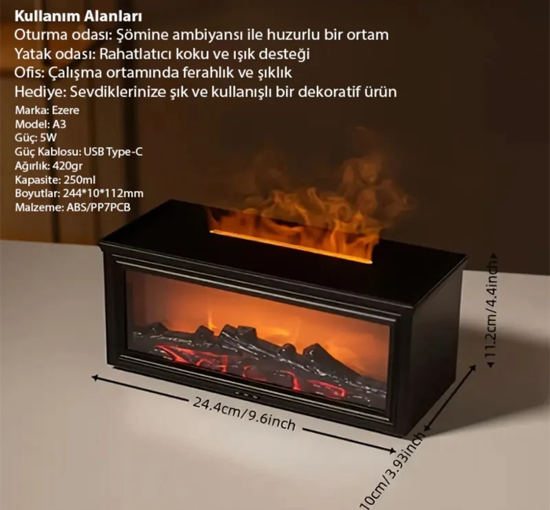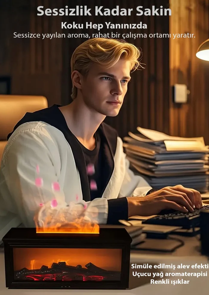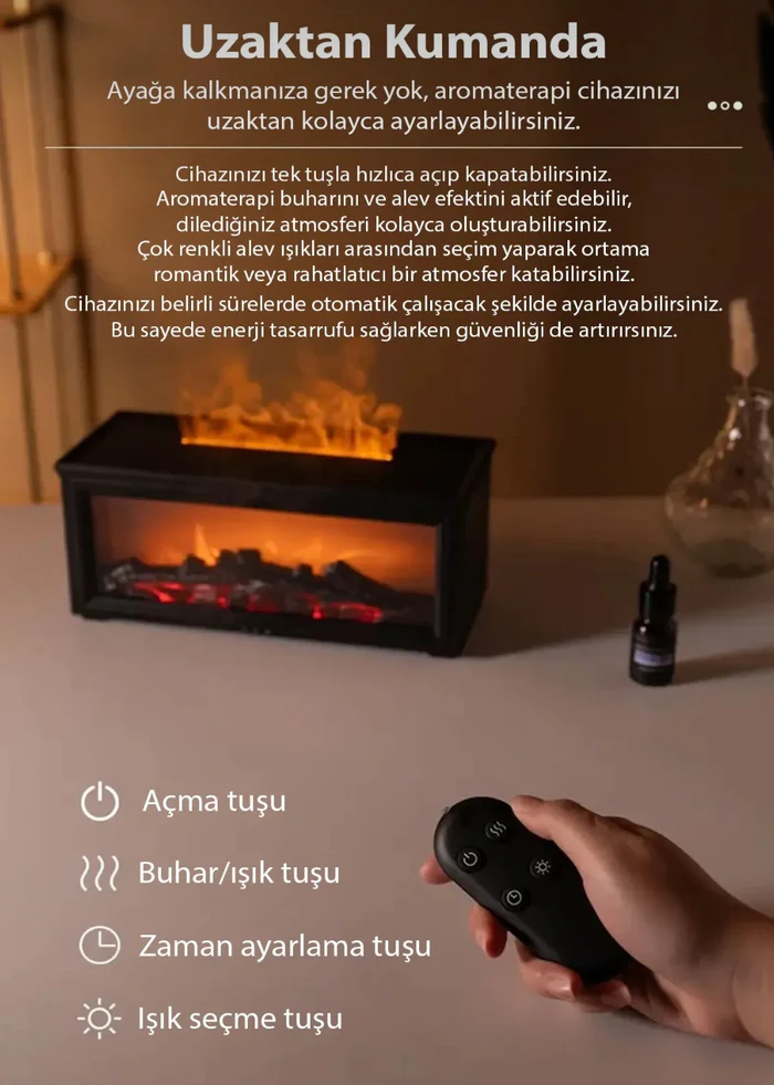 🌟 Şömine Tasarımlı 7 Renkli Nemlendirici & Difüzör 3D alev efektiyle sıcak şömine hissi, ultrasonik buharla ferah koku yayar. Sessiz, güvenli ve zamanlayıcılı.